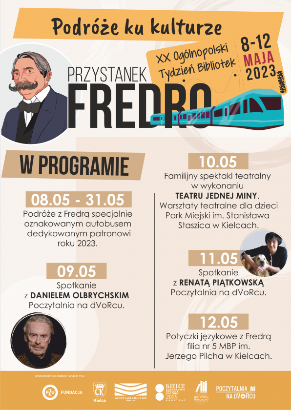 Jubileuszowy Ogólnopolski Tydzień Bibliotek odbywać się będzie pod hasłem „Moja, Twoja, Nasza – BIBLIOTEKA!”. Miejska Biblioteka Publiczna im. Jerzego Pilcha w Kielcach proponuje czytelnikom w różnym wieku wiele atrakcji, a wszystko dzięki projektowi „Podróże ku kulturze. Przystanek: Fredro”. Przedsięwzięcie, którego zadaniem jest promocja czytelnictwa i upamiętnienie Aleksandra Fredry w 230. rocznicę jego urodzin, zostanie sfinansowane ze środków Fundacji PZU. Od 8 do 12 maja Biblioteka zaprasza do wspólnego celebrowania bibliotekarskiego święta. Zapowiada się 5 dni fascynujących podróży.