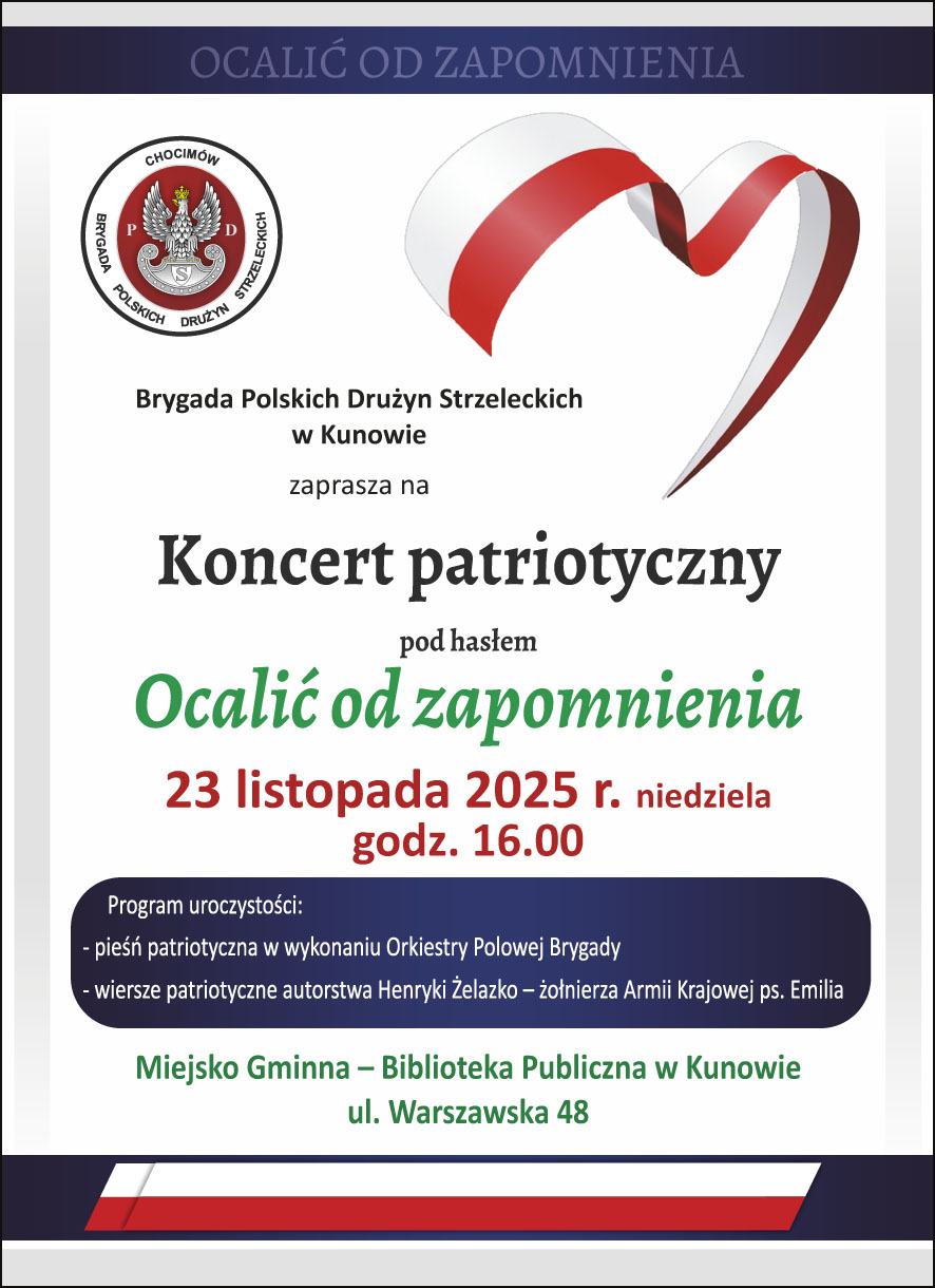 Prezes Brygady Polskich Drużyn Strzeleckich Jerzy Brożyna informuje, że wydarzenie odbędzie się w Miejsko-Gminnej Bibliotece Publicznej w Kunowie.