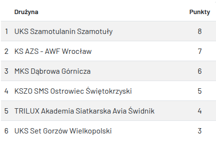 Tabela końcowa turnieju 1/4 Młodzieżowych Mistrzostw Polski Juniorek grupa 2 .