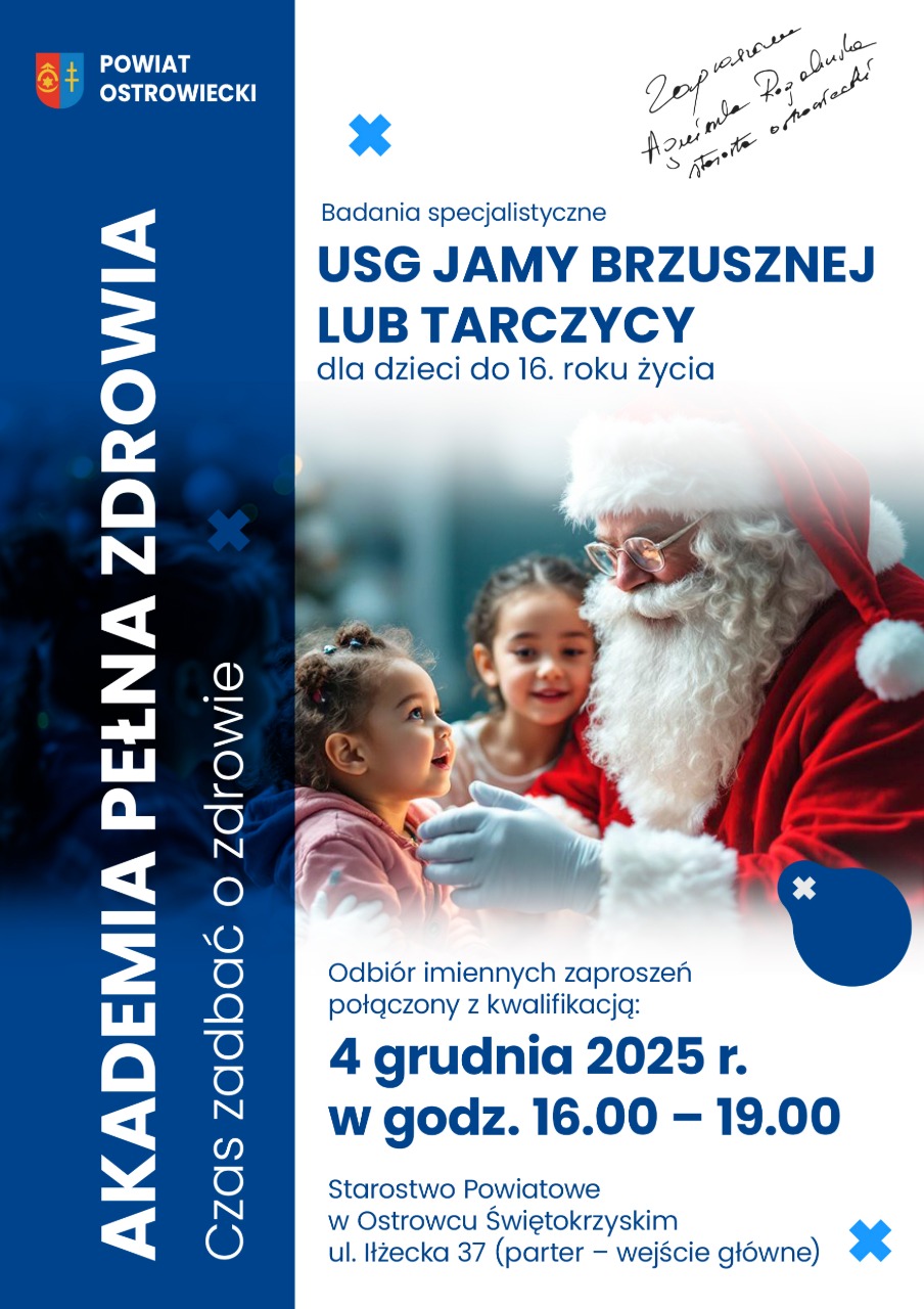 Starostwo Powiatowe w Ostrowcu Świętokrzyskim kontynuuje działania prozdrowotne w ramach programu Akademia Pełna Zdrowia. Tym razem najmłodsi mieszkańcy powiatu będą mogli skorzystać z bezpłatnych badań USG jamy brzusznej lub tarczycy. Badania skierowane są dla dzieci i młodzieży do 16. roku życia.